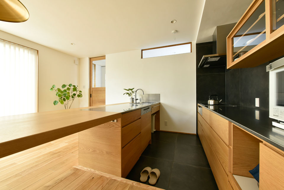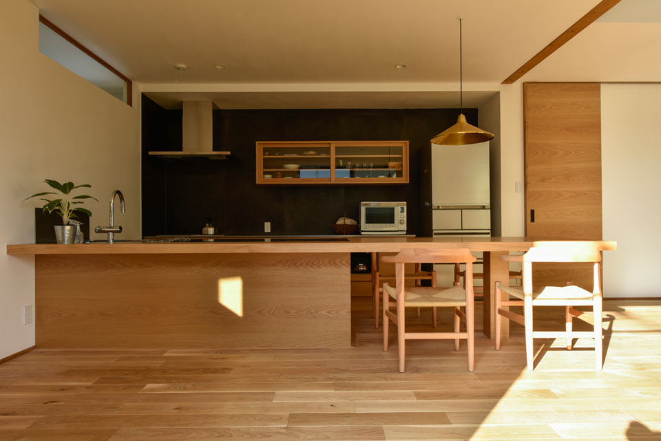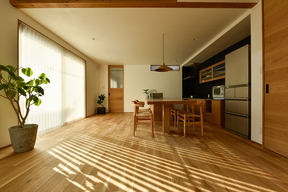 リビング部分には極力モノを置かず、また、あえて収納も設けないようにされました。そのため、モノを買うときもじっくり考えて、衝動買いはしないように心がけておられるようです。また、配色的にもシンプルになるようにと、リビングの天井もフローリングの素材と同じオーク材貼りになりました。