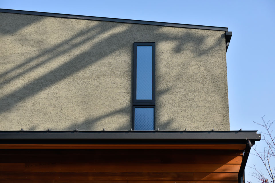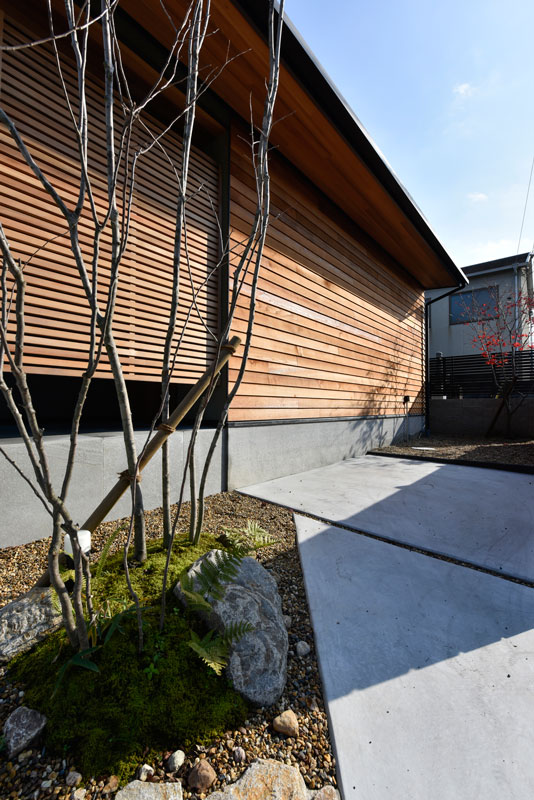 モスグリーンの外壁色と相まって、落ち着きのあるたたずまいを醸し出します。