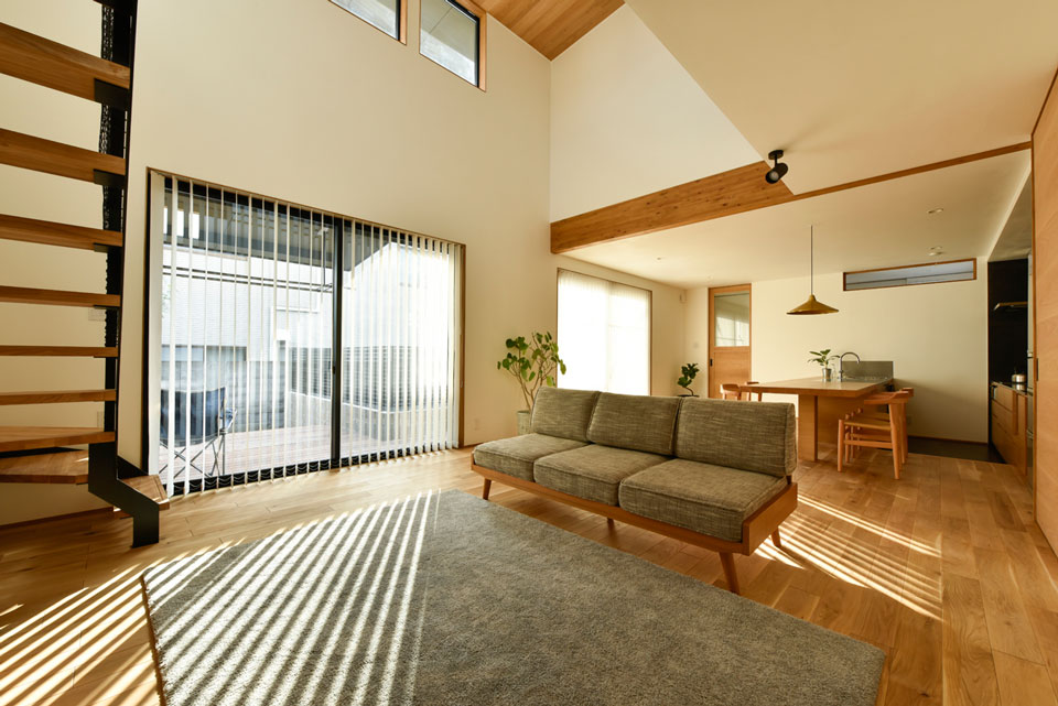 車の交通量の多い通りに面するため、道路側には開口部を設けないことで騒音の侵入を防ぐ工夫もされています。