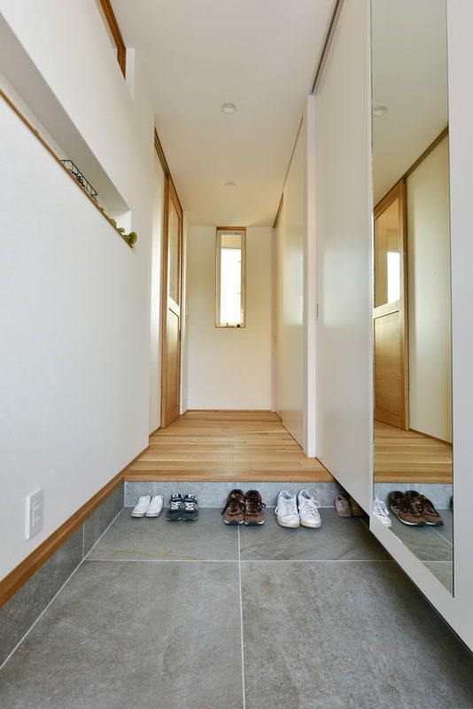 オモテにモノを出さないぶん、逆に収納の容量はたっぷりと設けることにしました。主寝室横のウォークインクローゼットも奥行きがあり、十分な衣類を収めることができます。また、前面道路に面した壁と玄関ホールの間に収納空間を設けることで、収納量を増やすとともに、外からの騒音を遮ることもできました。