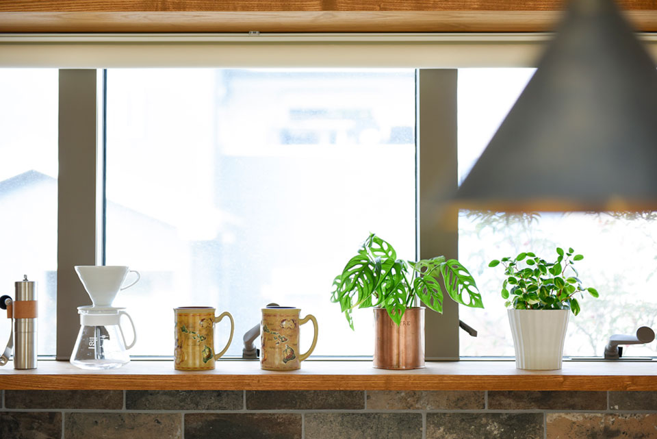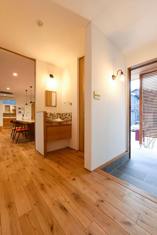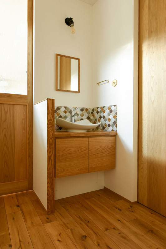 また、吊戸棚を付けないことで窓を大きくすることができ、明るいキッチンとなりました。さらに、家事動線も考えて、キッチンの隣に造作での洗面台を設置した洗面所と洗濯室をレイアウトしました。洗面台はお客様にも使っていただけるよう、洗濯室との間には引き戸を設けて目隠しを。
