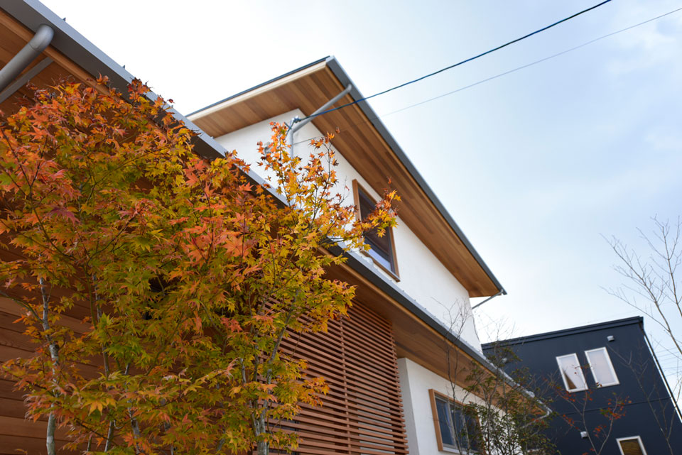 外観は、木材を多用した柔らかな質感が白い外壁と相まって優しい表情の家となりました。そのためか、ご近所の方から「この家を見ると心が癒やされます」と言われるそうです。