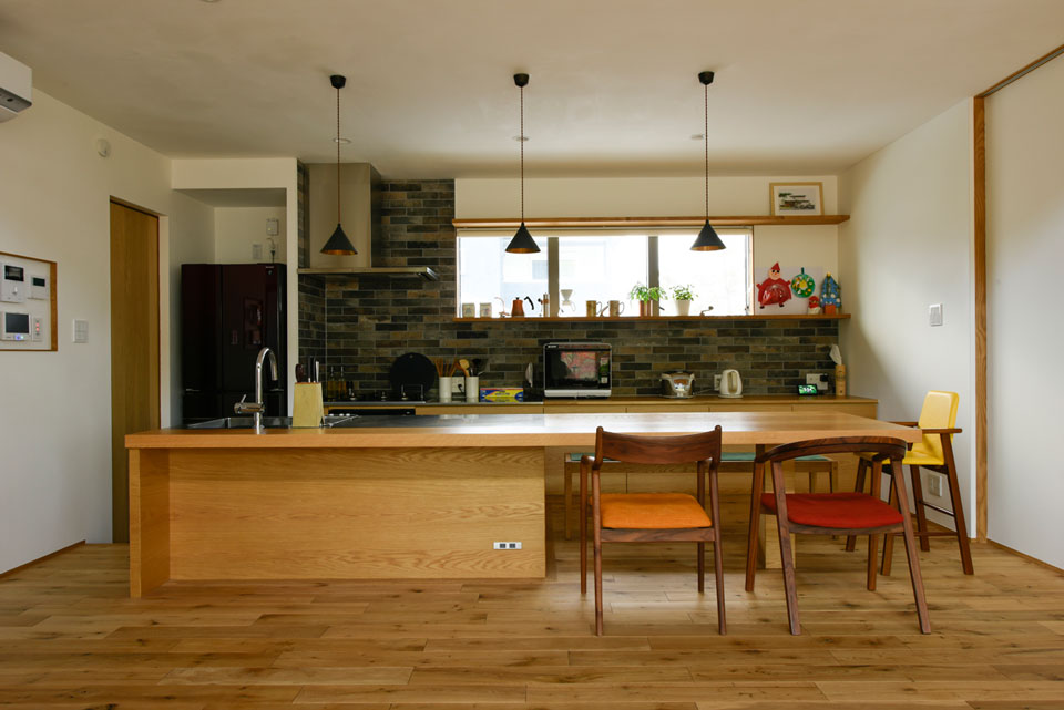 「壁面をレンガ調のタイルにすることで、汚れがあまり目立たなくて助かります」と奥様。