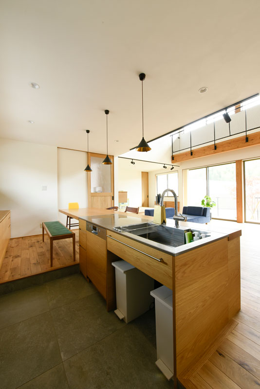 それが見事に形となりました。27帖のゆったりとしたリビングです。南側には建物が無いためたっぷりの光が入り、眺望が開けます。「外の景色を眺めながら調理ができるのが夢だったんです」と奥さま。