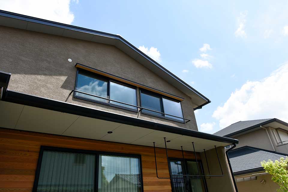 長くせり出した住宅の軒(のき)やひさしは、「家らしい形」を演出するともに、降雨による壁面の劣化を防いだり、夏の熱い日射をさえぎり室内に入れない効果があります。