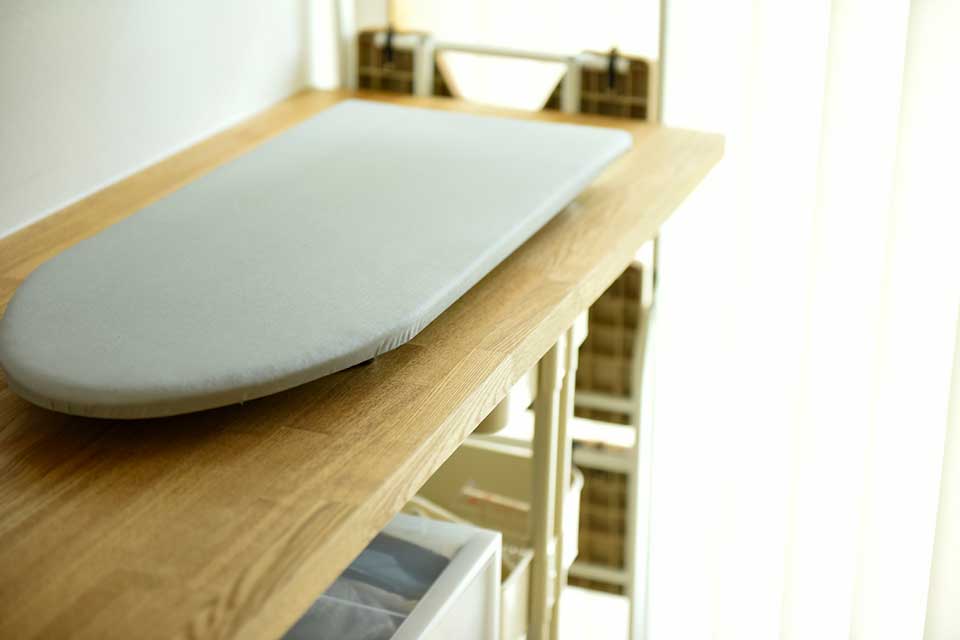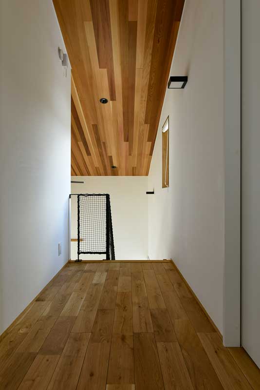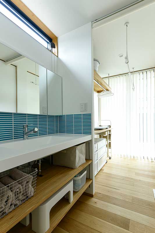 その奥には、宿題スペースにも家事コーナーにもなる多目的なデスクを造作しています。また、奥は、浴室、ガス乾燥機を備えた洗濯室、洗面所、そしてランドリースペースが一直線に並んだ機能的なレイアウトになっています。リビングの一角には、「トレーニングスペース」を設け、ランニングマシンを置くためにあらかじめ床を補強も行いました。