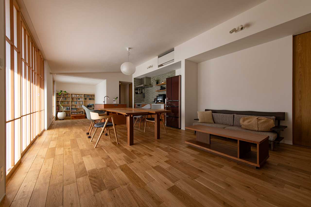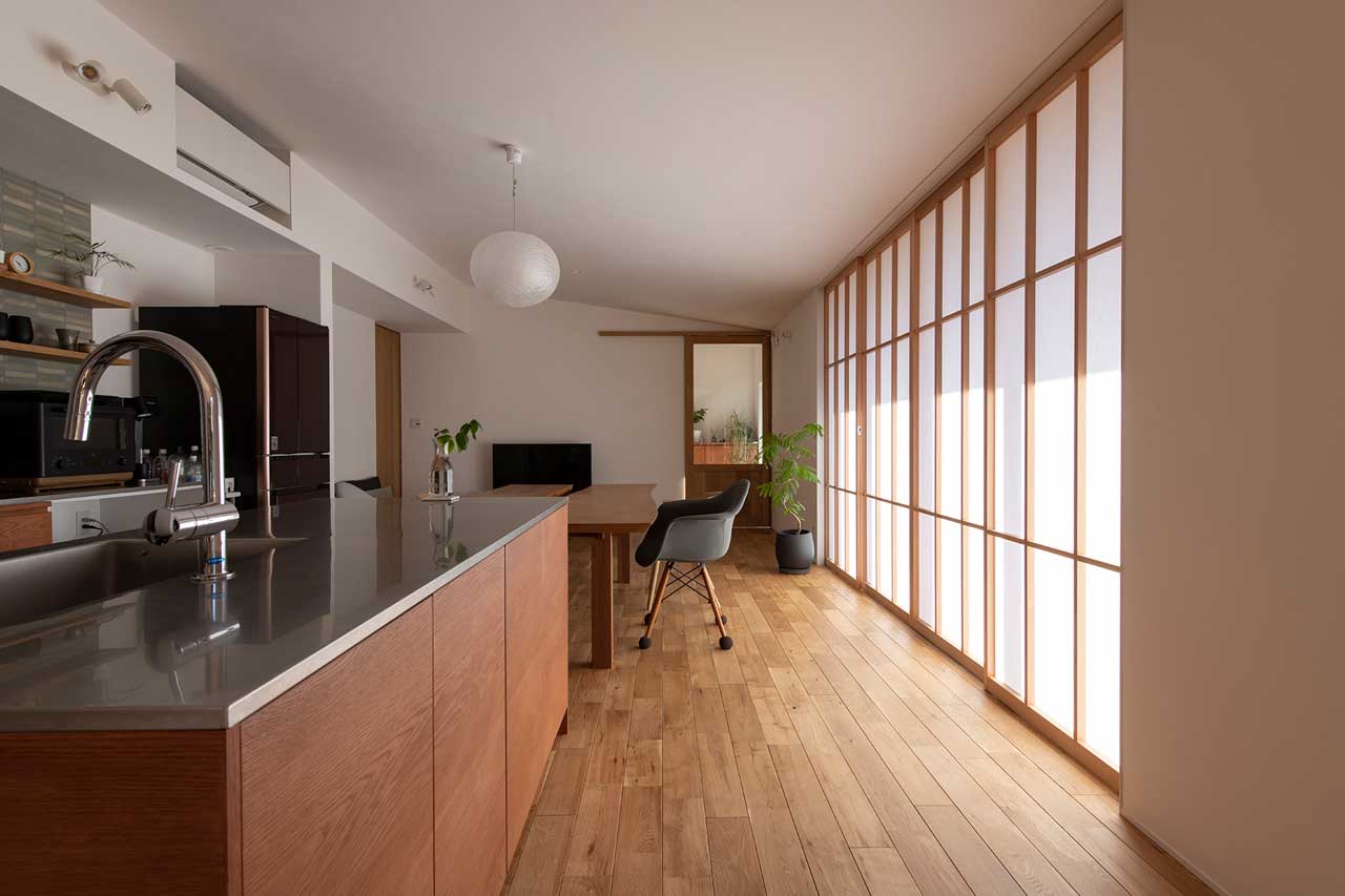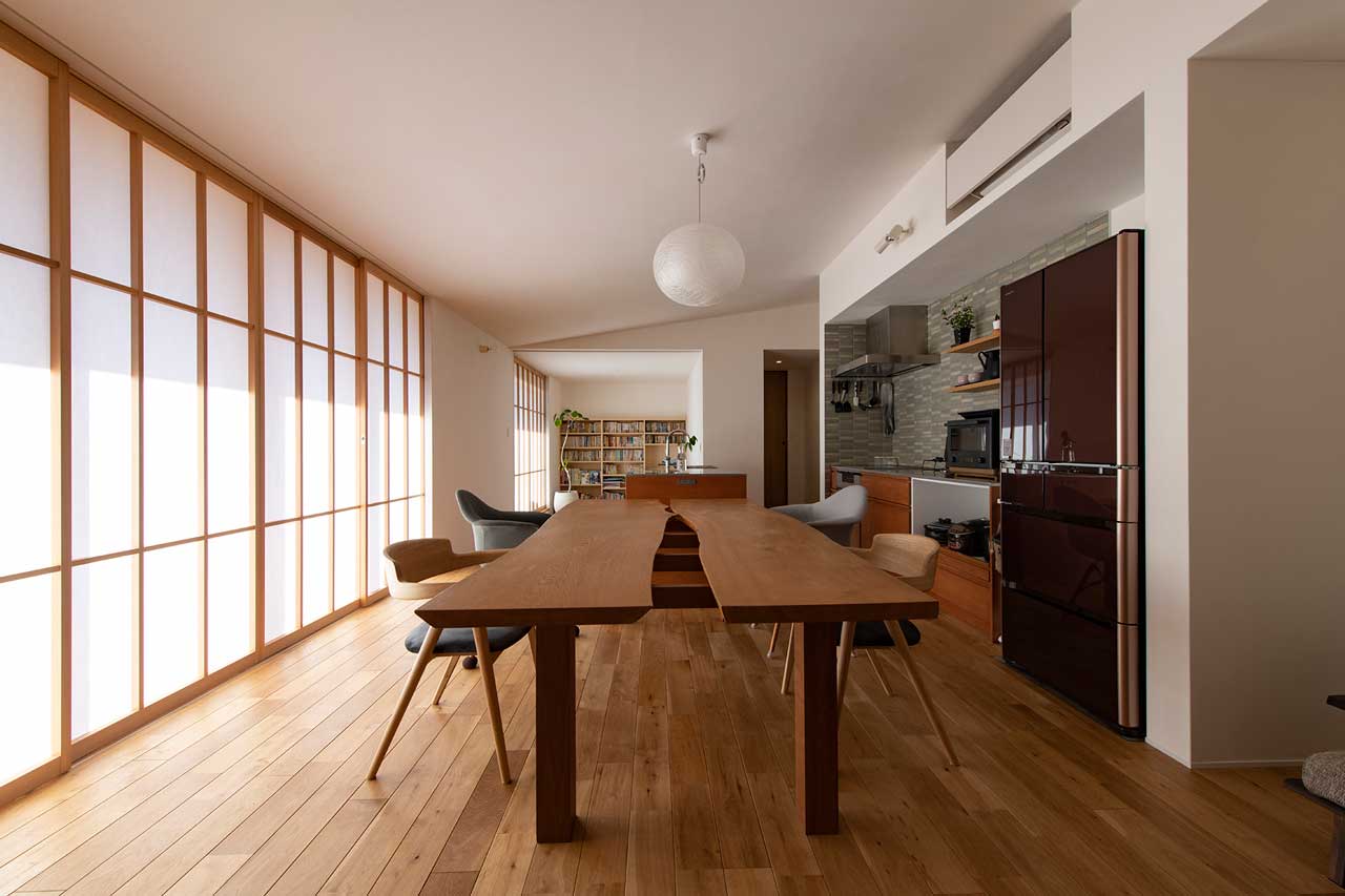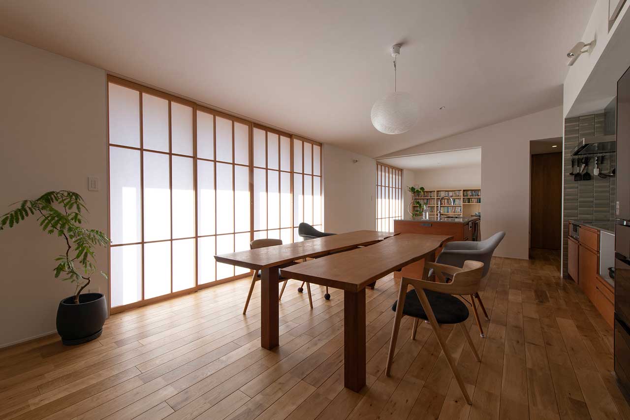 また、リビングの窓にはカーテンやブラインドの代わりに障子を組み込み。