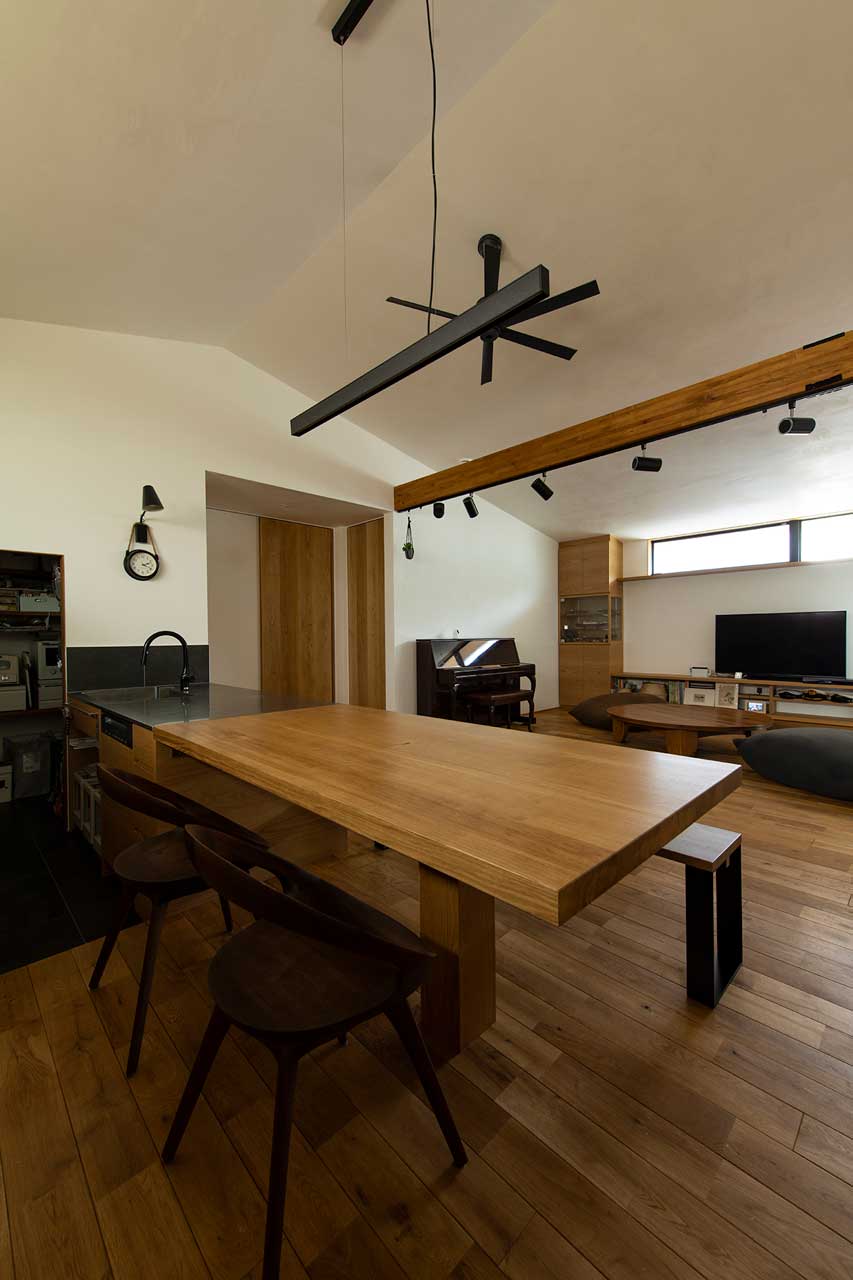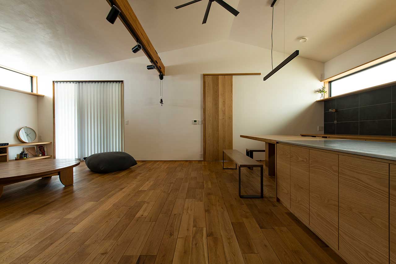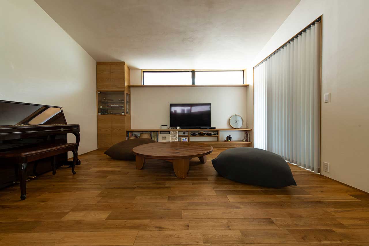 F様ご夫妻がイメージされていたのは、外からの光をたっぷりと取り込むような家ではなく、ホテルやマンションのように落ち着いた空間。そのため、大きな開口部は設けず、昼間でも外のにぎわいが室内まで届くことはありません。