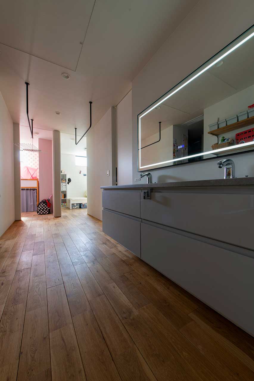 逆に、ご夫婦やお子さまの部屋は、建物の最奥へ。中間がゆったりとしたLDKや水まわり空間というレイアウトになっています。