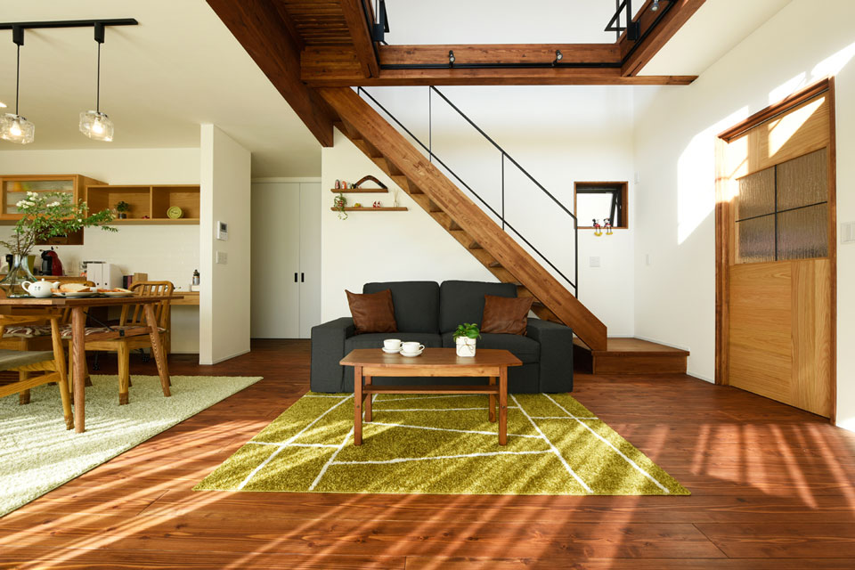 外観は黒のガルバニウム鋼板とウッドによるシャープな印象、中に入ると造作家具や建具の木目が上質で豊かな空気感のお宅の紹介です。梁や柱は、SE構法の素材色のままではなく、ダークブラウンに塗装、空間が締まった印象になりました。床も同系に塗装することで統一感のある内装に仕上がっています。