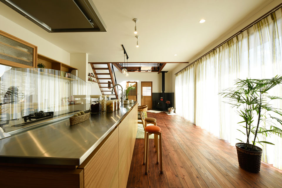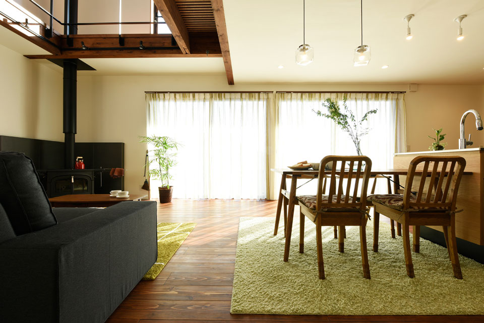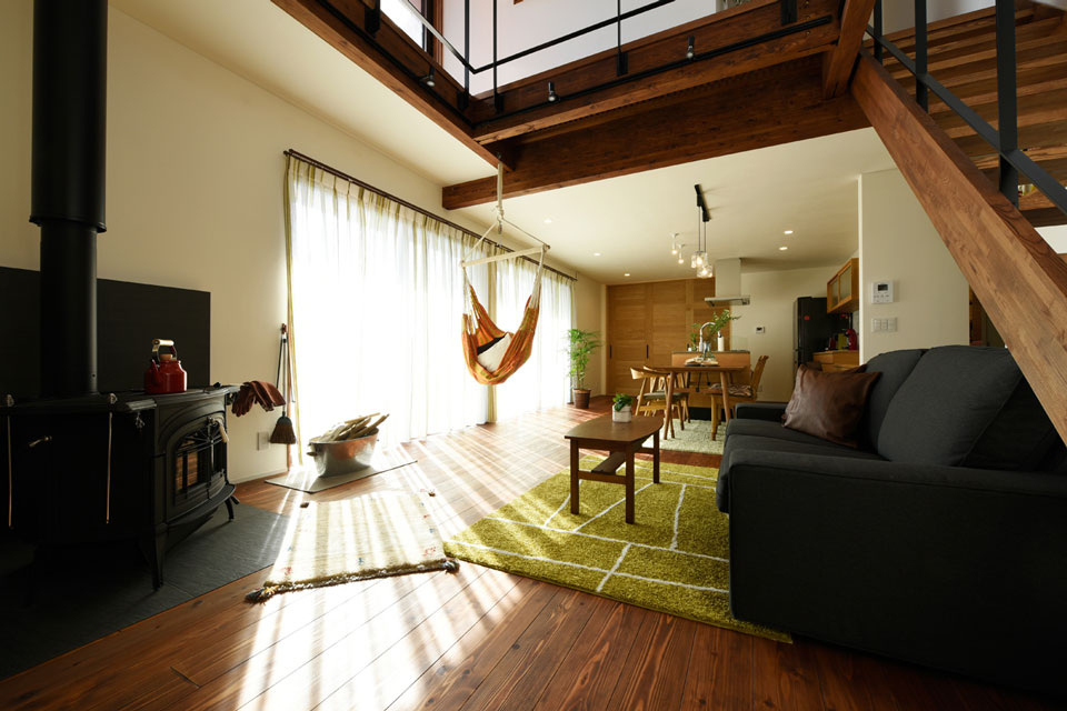 マイ工務店を選ばれたのは、規格が決まっているハウスメーカーと違って設計が自由なところが理由だったそう。また、「SE構法を採用されているのもポイントでしたね。それと、断熱材にアイシネンが使われていることも。ここは、標高が500メートルほどあるので、冬は寒いんです。日によっては、マイナス6、7度になる朝もあるんですよ」と、ご主人。そのため、家づくりの当初から、設置を希望されていたのが薪ストーブ。マイ工務店のモデルハウスにあるものより、大きなタイプが設置されています。